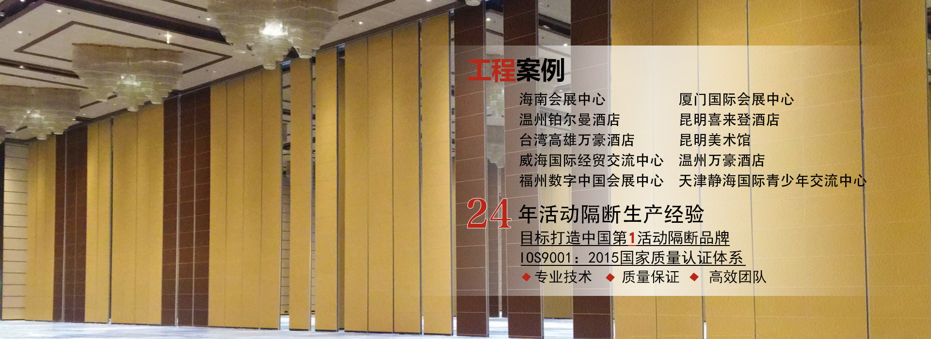 135 3317 7889 何經(jīng)理/189 8866 7889李經(jīng)理廣東一固隔斷制品有限公司成立于1998年,國家高新技術企業(yè),位于中國佛山市南海區(qū)里水鎮(zhèn),是一家專業(yè)從事活動隔斷和辦公室玻璃隔斷系統(tǒng)開發(fā),銷售,生產和售后服務的一站式生產廠商。公司產品廣泛應用于星級飯店,寫字樓,餐廳,宴會廳,會議中心或會展中心等商業(yè)場合,提供便捷有效的空間管理解決方案。最高門板高度可達20米,最大隔音系數(shù)可達56分貝。 一固公司擁有兩個現(xiàn)代化的生產基地,占地超過10,000平方米,...